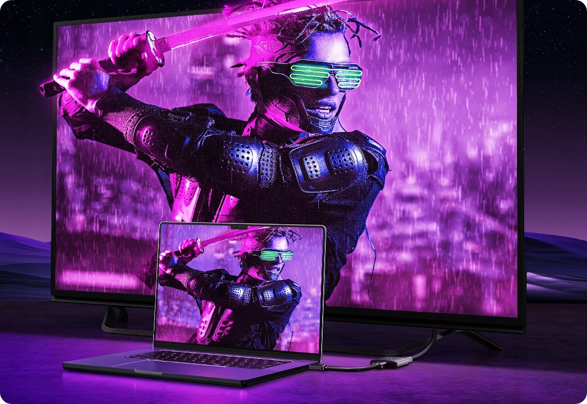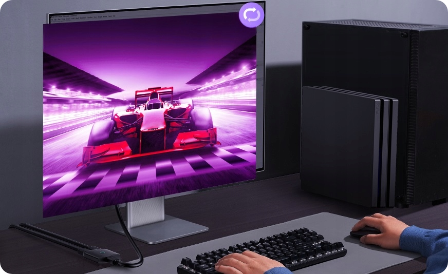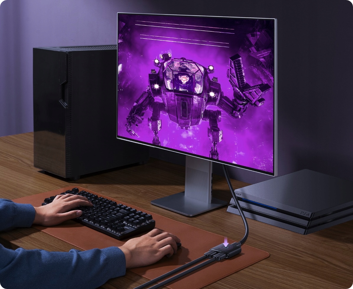 2 in 1 out – Podłącz dwa urządzenia do jednego monitora. Bez zbędnego przepinania kabli, jednym kliknięciem przełączaj się między dwoma źródłami obrazu. To idealne rozwiązanie, gdy chcesz korzystać z dwóch urządzeń na jednym ekranie – na przykład laptopa i konsoli do gier.