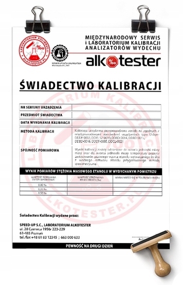 Do każdego skalibrowanego alkomatu dodajemy również Świadectwo Kalibracji czyli dokument potwierdzający pomyślne skalibrowanie testera.
