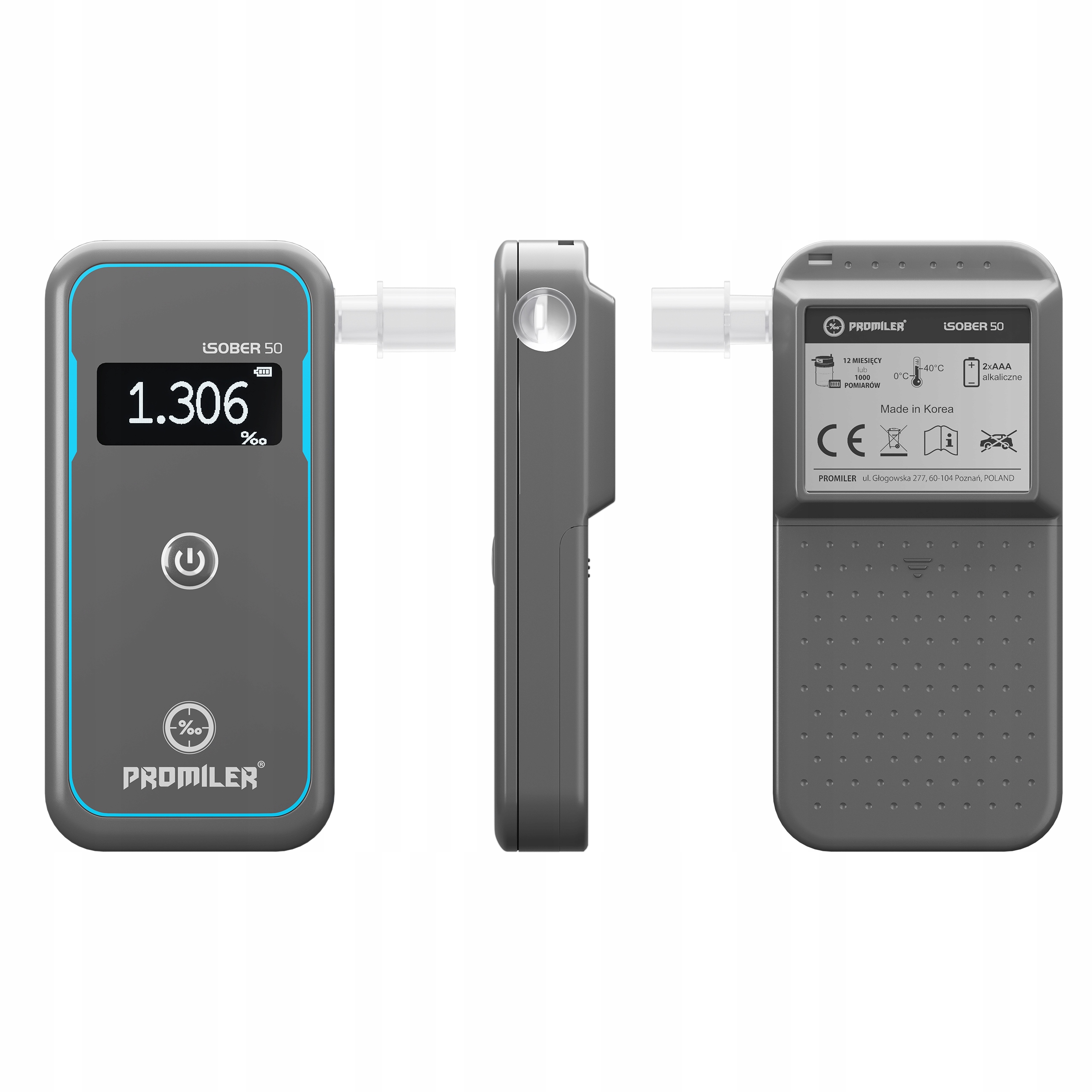 Alkomat PROMILER iSOBER 50 to najnowocześniejszy model w ofercie PROMILER, który łączy w sobie zaawansowaną technologię i niezrównaną precyzję, gwarantując błyskawiczne i dokładne wyniki. Urządzenie wyposażone jest w platynowy sensor Qmol 4.0, zapewniający dokładność pomiaru na poziomie +/- 0,06 ‰ przy 1,00 ‰. To technologia stosowana w profesjonalnych alkomatach – teraz dostępna dla każdego!
