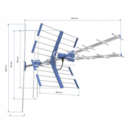 - Wysoki zysk – 14 (UHF), 7 (VHF) dBi;