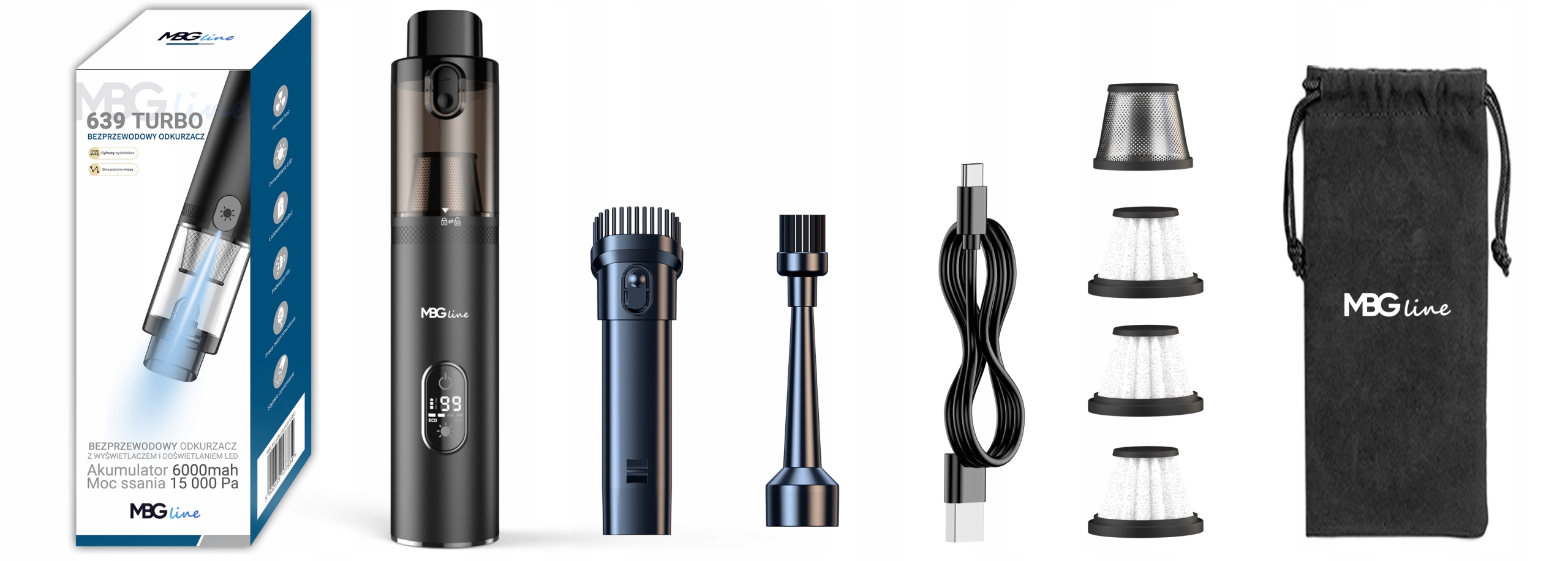 MBG Line 639 TURBO wyróżnia się również bogatym zestawem akcesoriów i wysoką jakością wykonania. Solidna obudowa z aluminium, pojemny akumulator 6000mAh oraz aż 3 wymienne filtry HEPA zapewniają niezawodność i łatwość konserwacji. Dodatkowy metalowy filtr oraz praktyczny pokrowiec w zestawie czynią go idealnym towarzyszem podróży, gotowym sprostać każdemu wyzwaniu. To kompleksowe rozwiązanie dla tych, którzy cenią czystość i wygodę w każdym detalu.