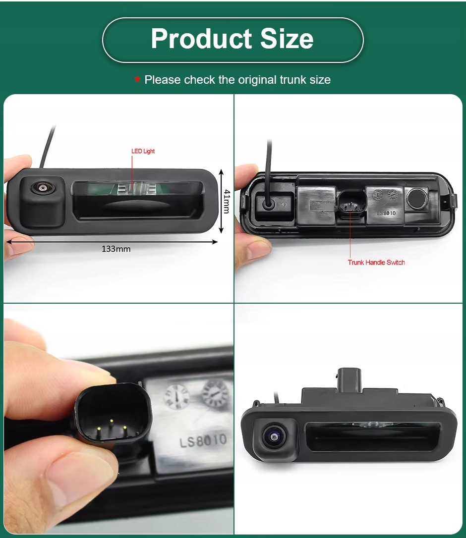 Dedykowana kamera montowana jest w miejscu klamki bagażnika, dzięki czemu wygląda jak zainstalowana fabrycznie. Jest wodoodporna i wstrząsoodporna, a jej prosty i skromny design prezentuje się schludnie i nie przyciąga uwagi. Wbudowany microswitch zastępuję fabryczny, pozwalając na bezproblemowe otwarcie bagażnika.