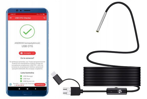 - W naszej kamerze endoskopowej został zastosowany wysokiej klasy przetwornik obrazu. Obraz może być odbierany w telefonach i urządzeniach z systemem Android wyposażonych w złącze USB OTG.