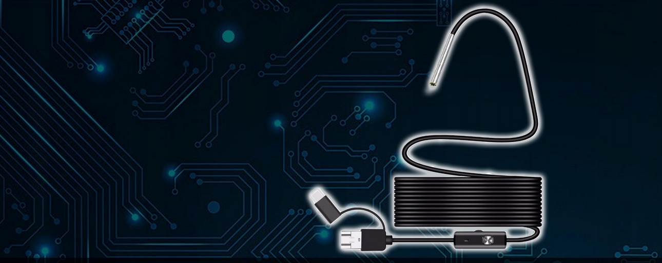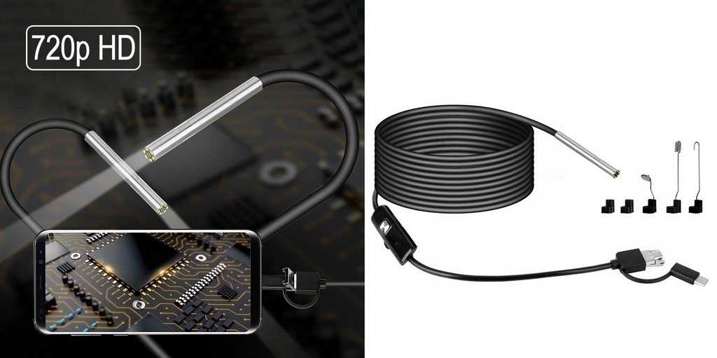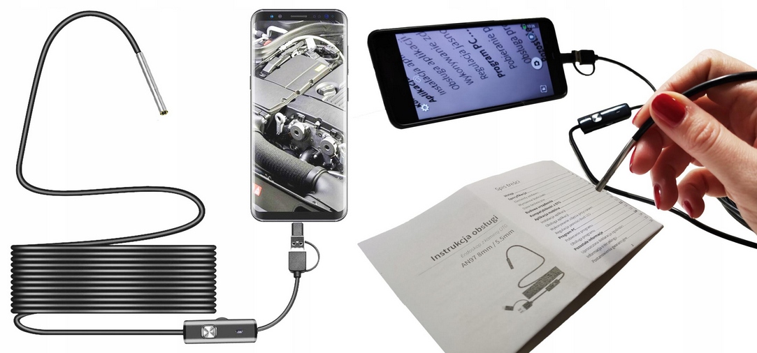 - Kamera endoskopowa USB OTG na przewodzie typu HARD o długości 5m wraz z trzema typami USB (USB / microUSB / USB-C)