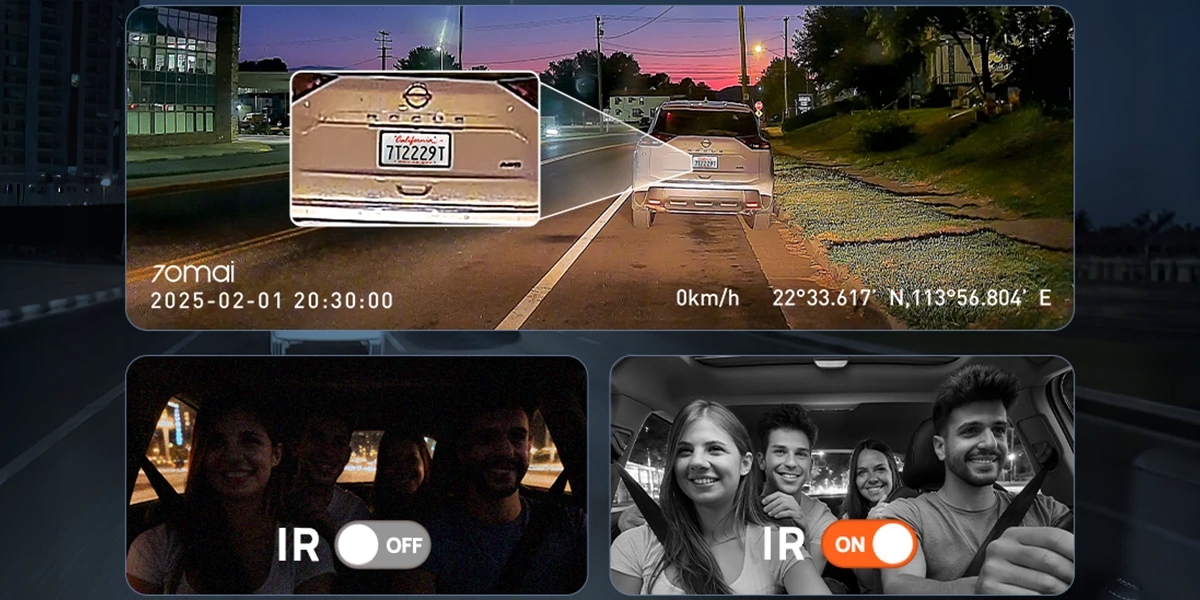 Moduł wewnętrzny 70mai T400 z kątem widzenia 147° oraz czterema diodami IR pracującymi w podczerwieni monitoruje kabinę 24/7, także w ciemności, co istotnie zwiększa poziom bezpieczeństwa kierowcy i pasażerów. Użytkownik może przełączać tryb podczerwieni automatycznie lub ręcznie, zachowując kontrolę nad tym, czy nagranie ma być w czerni i bieli, czy w kolorze w lepiej oświetlonych warunkach. Rozwiązanie idealnie sprawdza się w taksówkach, autach na aplikacje czy samochodach rodzinnych.