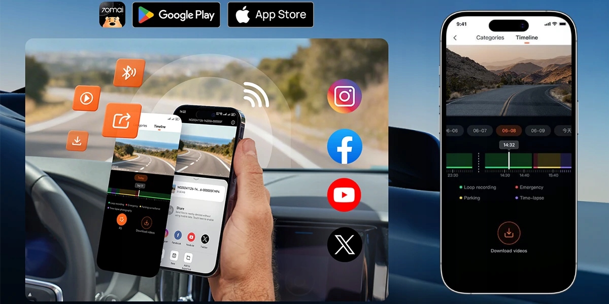 Dzięki One-Tap App Connect kamera 70mai T400 szybko łączy się z aplikacją mobilną, która automatycznie wyszukuje urządzenie przez Bluetooth. Po nawiązaniu połączenia możesz przeglądać, pobierać i udostępniać nagrania bezpośrednio z telefonu, a także wygodnie zmieniać ustawienia. Przyspiesza to obsługę zarówno prywatnym kierowcom, jak i osobom zarządzającym flotą.