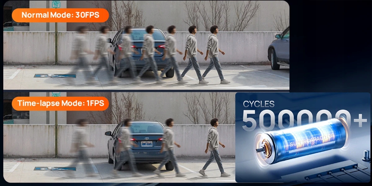 Tryb nagrywania poklatkowego 1 kl./s w 70mai T400 pozwala tworzyć ciągły zapis wydarzeń przy niskim zapotrzebowaniu na energię i wyraźnie mniejszym zużyciu miejsca na karcie. Zasilanie oparte o superkondensator wytrzymujący skrajne temperatury od -10°C do 60°C i 500 000 cykli ładowania, co w praktyce pomaga bezpiecznie domknąć zapis pliku nawet przy nagłym odcięciu zasilania. To kluczowa zaleta dla aut stojących na zewnątrz przez cały rok.