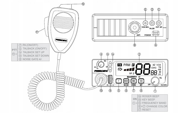 CB RADIO PRESIDENT BARRY II PLUS 12V/24V USB VOX ASC