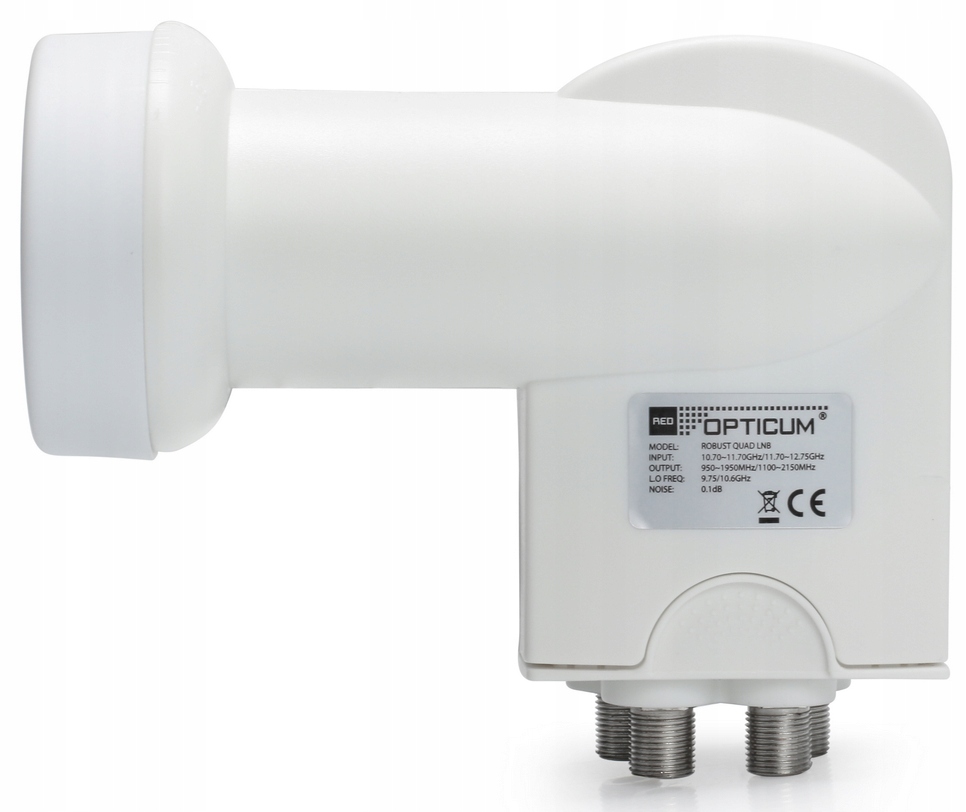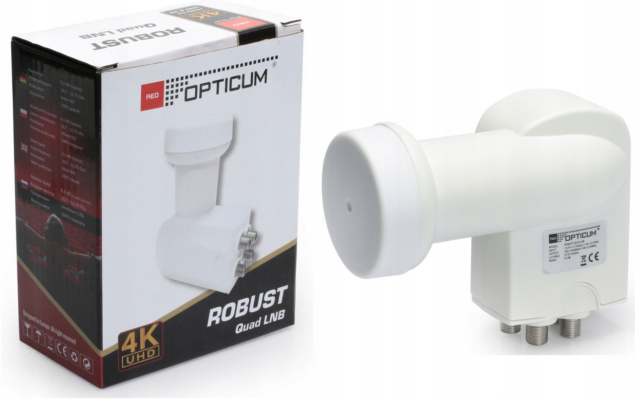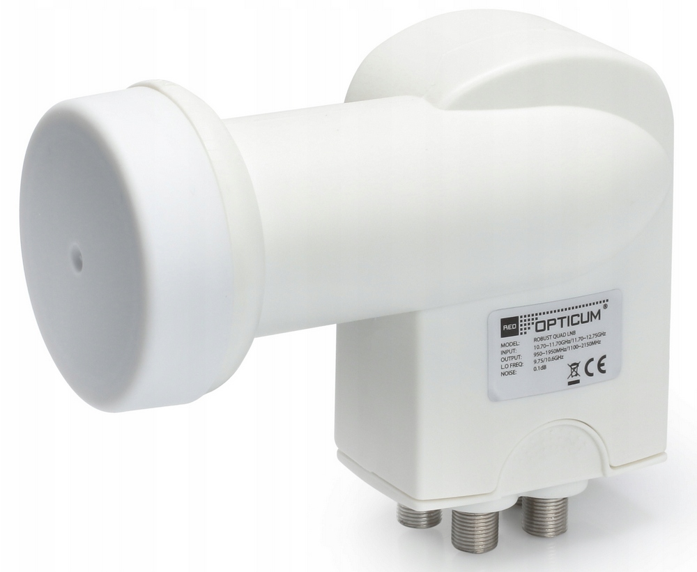 Poczwórny konwerter Quad Opticum Robust służy do odbioru sygnału z jednego satelity przez cztery niezależne tunery. Posiada osłonę przeciwdeszczową. Charakteryzuje się bardzo niskim współczynnikiem szumów równym 0,1dB.