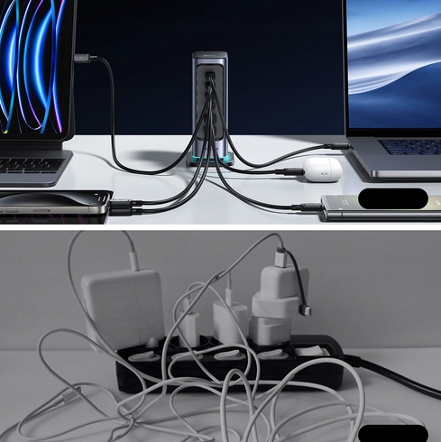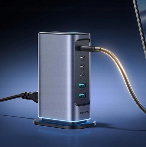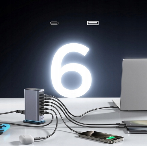 - Może ładować sześć urządzeń jednocześnie, oszczędzając czas i miejsce. Cztery porty USB-C i dwa porty USB-A oferują łączną moc 65W.
