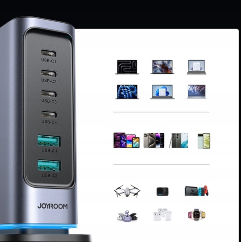 Z ładowarką Joyroom JR-TCM02 naładujesz aż sześć urządzeń w tym samym czasie, co oznacza koniec z czekaniem na wolne gniazdo. Cztery porty USB-C i dwa porty USB-A oferują łączną moc 65W, co pozwala na jednoczesne ładowanie telefonu, tabletu, laptopa i innych urządzeń. Jest to niezwykle praktyczne rozwiązanie dla rodzin lub osób posiadających wiele gadżetów.