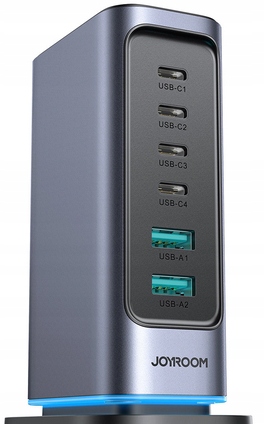Wieloportowa ładowarka Joyroom JR-TCM02 GaN o mocy do 65W ze złączami 4x USB-C i 2x USB-A (wtyczka EU) – CIEMNSZARA