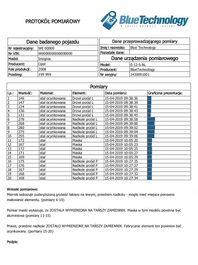- Wykrycie oraz informacja o ocynku (Zn), aluminium (AL), stal (FE),