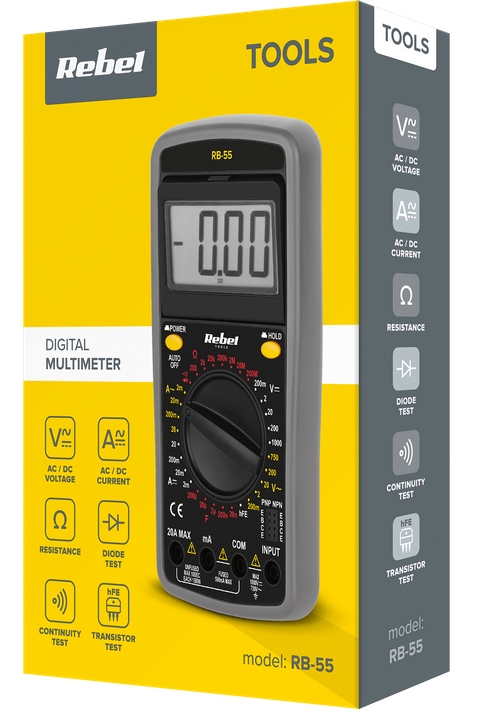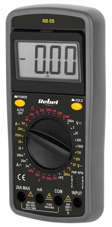 Miernik uniwersalny REBEL RB-55 to precyzyjne narzędzie pomiarowe, które sprawdzi się zarówno w zastosowaniach domowych, jak i profesjonalnych. Dzięki szerokiemu zakresowi funkcji i pomiarów, umożliwia dokładną analizę parametrów elektrycznych oraz diagnostykę urządzeń.