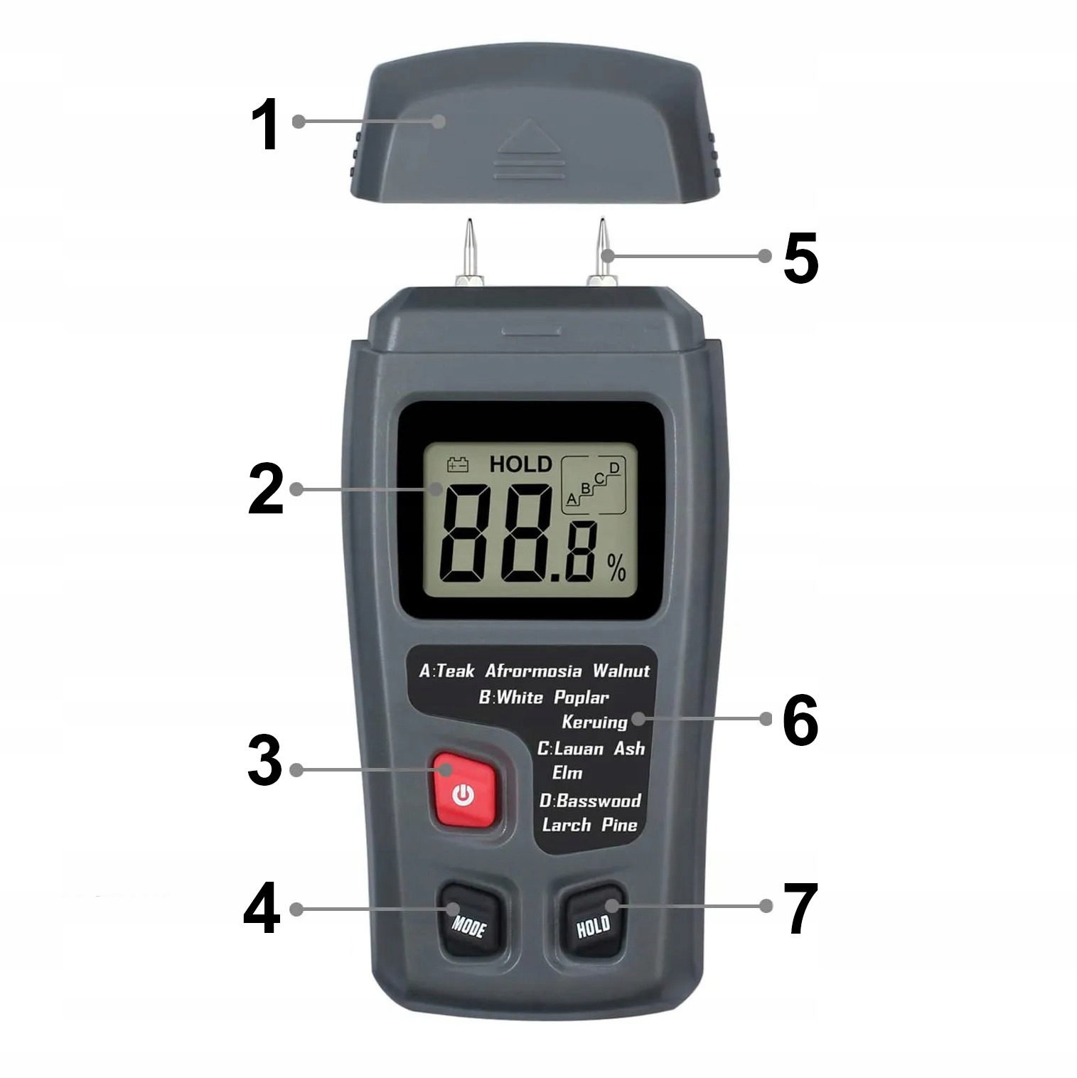 - Wyświetlacz LCD (niski poziom baterii, poziom wilgotności, wstrzymanie pomiaru, wybrany zakres pomiaru)