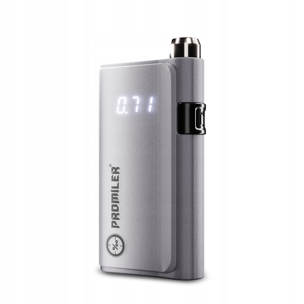Elektronika i podzespoły zostały zamknięte w eleganckiej srebrnej obudowie. Ciekawym rozwiązaniem jest przycisk umieszczony z boku alkomatu.