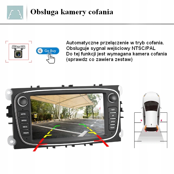 • Funkcja wejścia kamery cofania: dzięki Canbus obraz automatycznie przełączy się w tryb kamery cofania po wrzuceniu biegu wstecznego