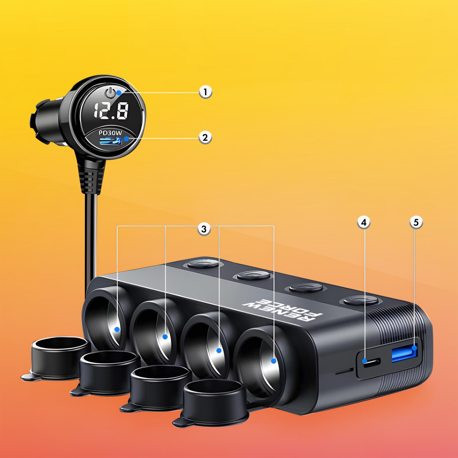✅Nowoczesny rozdzielacz gniazda zapalniczki, wyposażony w dodatkowe porty USB oraz woltomierz, idealnie nadaje się dla osób, które często podróżują i potrzebują jednocześnie ładować wiele urządzeń w samochodzie. Poniżej znajdziesz wszystkie kluczowe cechy produktu oraz jego funkcje.