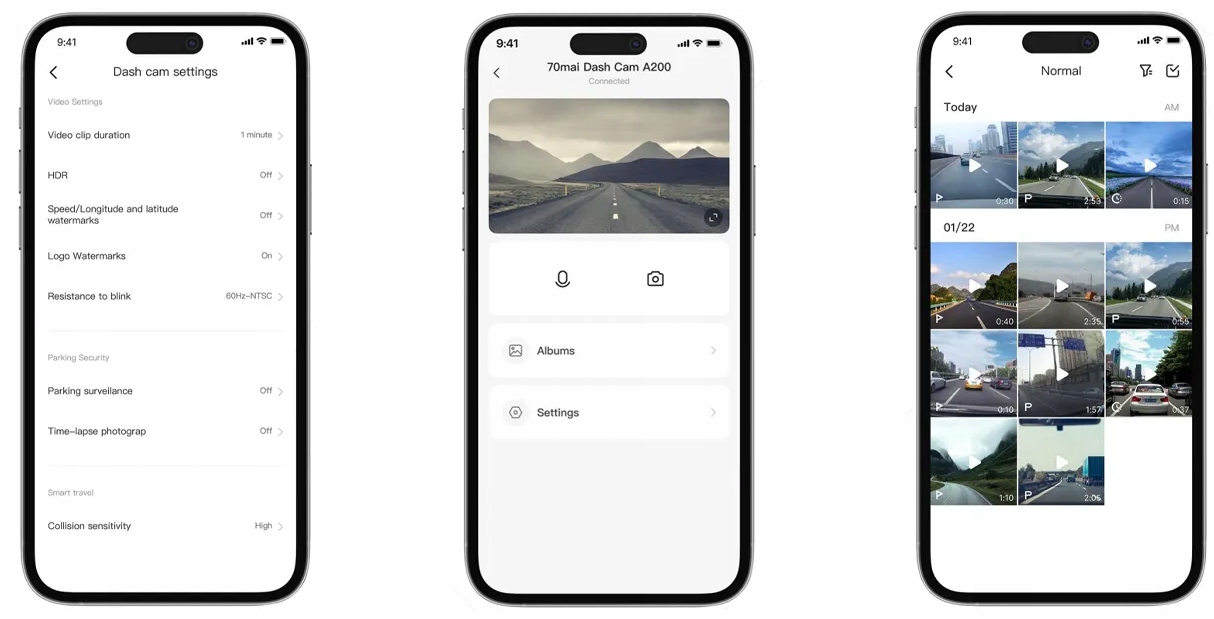 Dzięki dedykowanej aplikacji 70mai w języku polskim będziesz mieć możliwość zarządzania czasem nagrywania, rozdzielczością wideo, czułością G-sensora oraz innymi parametrami.