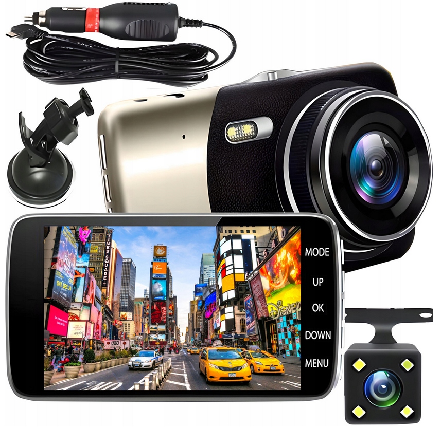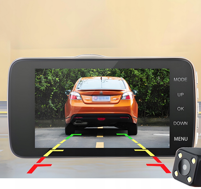 Samochodowy rejestrator jazdy, urządzenie niezbędne dla każdego kierowcy. Zestaw 2 kamer (przód, tył) plus duży wyświetlacz LCD. Nagrywarka samochodowa do rejestracji zdarzeń i kolizji.
