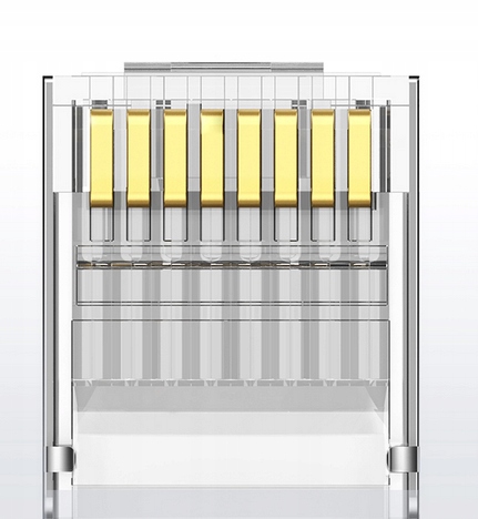 Wtyk modularny RJ45 8P8C Cat. 6, 5, 5e wykorzystywany jest do zakończeń przewodów internetowych typu skrętka. Wtyk wykorzystuje się w sprzęcie telekomunikacyjnym i komputerowym. Jest najbardziej rozpowszechniony jako podstawowe złącze do konstruowania sieci komputerowych. Produkt został wykończony niklowaną płytką oraz miedzianymi pozłacanymi stykami – zapobiega to utlenianiu materiału. W zestawie znajduje się 10 sztuk. Końcówki są bez przelotu.