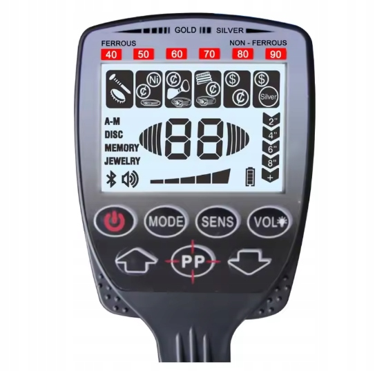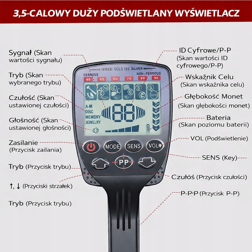 - Dodatkowe funkcje: regulacja czułości, sygnał dźwiękowy, zapamiętywanie wykrytego metalu