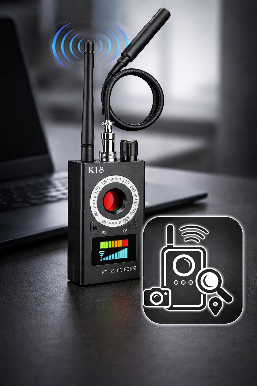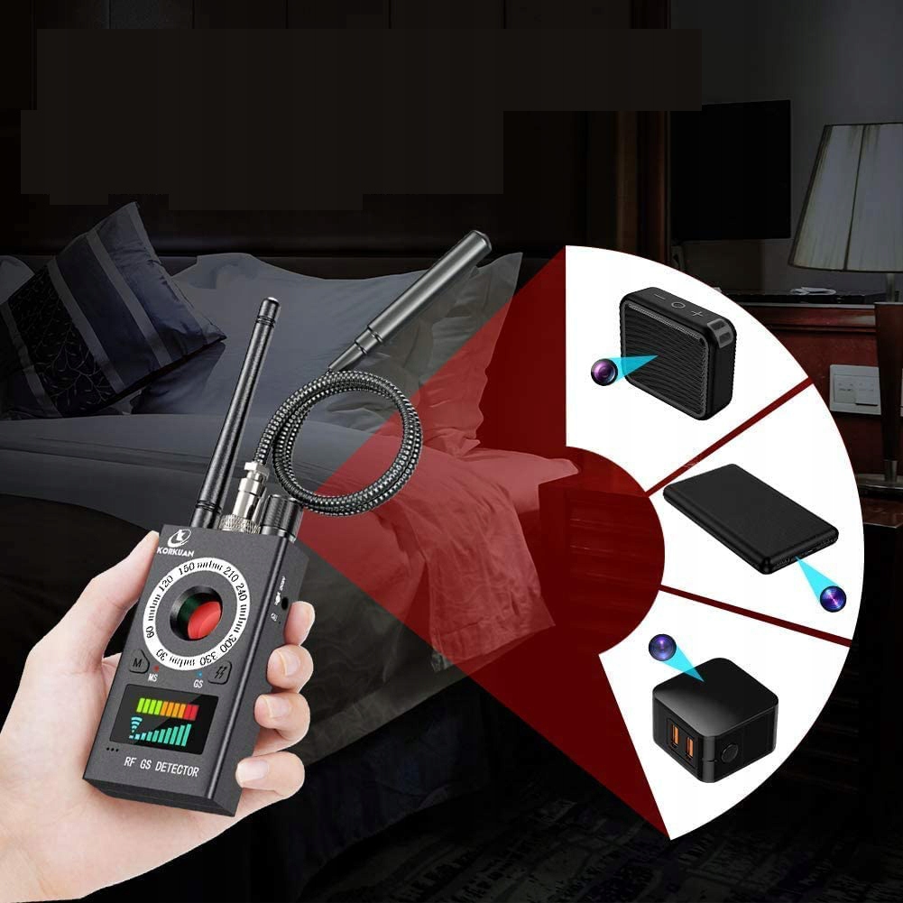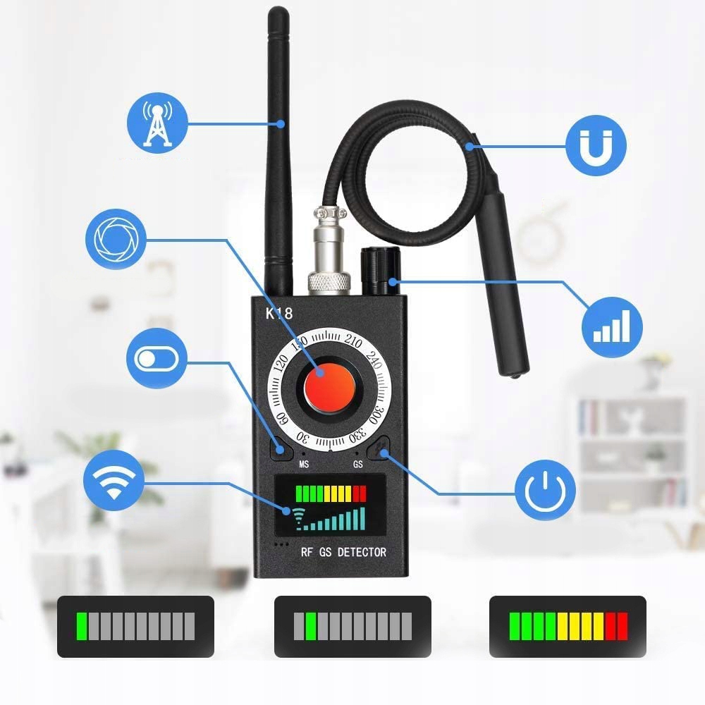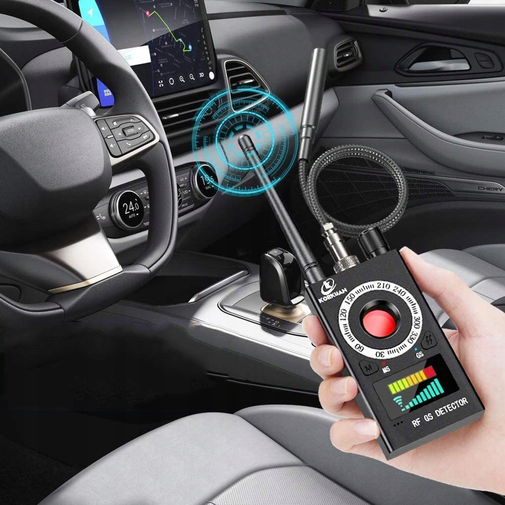 - ✅ Wszechstronne wykrywanie: wychwytuje sygnały radiowe RF (GSM, Wi‑Fi, Bluetooth), kamery ukryte (laserowe skanowanie), urządzenia GPS z czujnikiem magnetycznym.