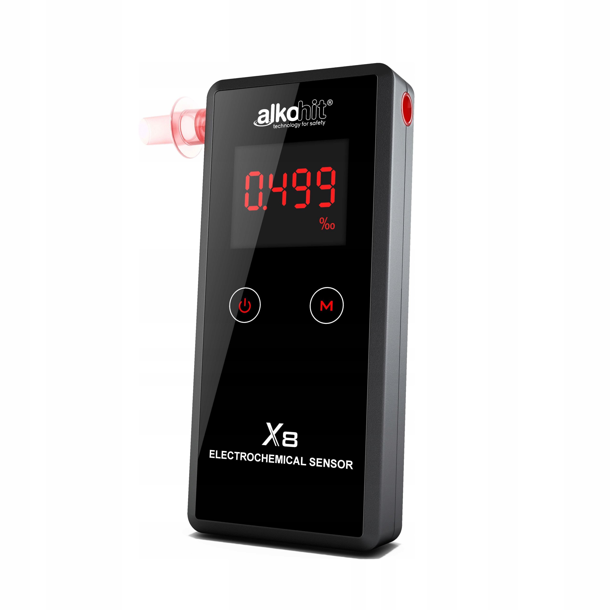 Stabilny czujnik elektrochemiczny z wysokim zakresem pomiarowym do 4,000‰ zapewnia dokładne wyniki pomiarów. Alkohit X8 posiada kompaktową obudowę oraz podświetlany na biało wyświetlacz umożliwiający odczytanie wyniku w nocy.