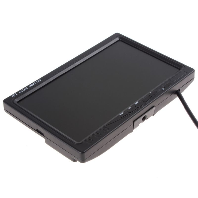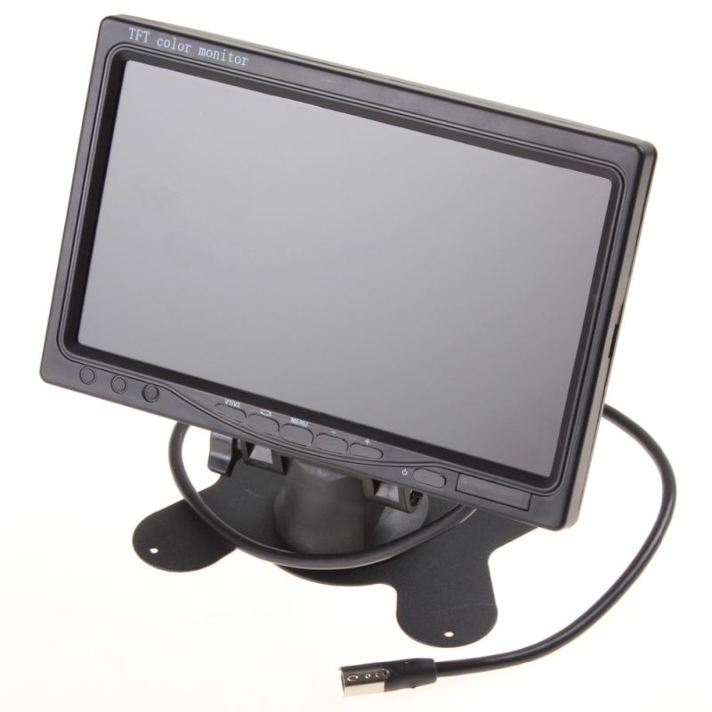 - Monitor 7″ kolor, 1/3″ CMOS, 800×480, NTSC/PAL, 2 niezależne kanały CH1/ CH2 (złącze cinch), contrast: 300:1, jasność: 250cd/m2